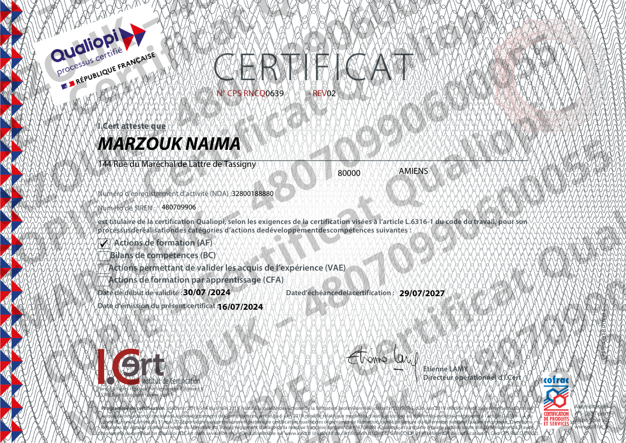 L’organisme NM Formation est certifié QUALIOPI au titre de la catégorie d’action suivante : action de formation